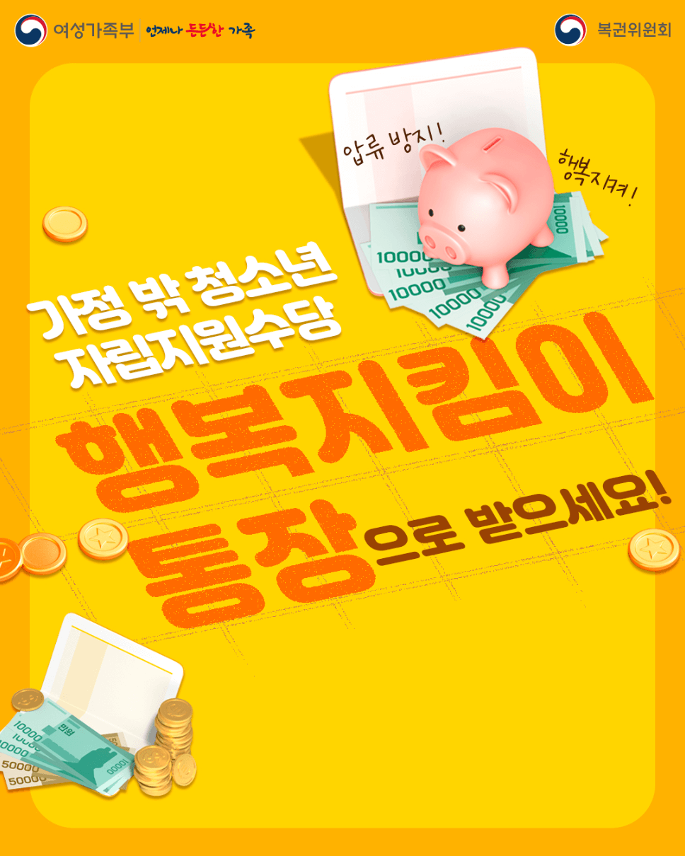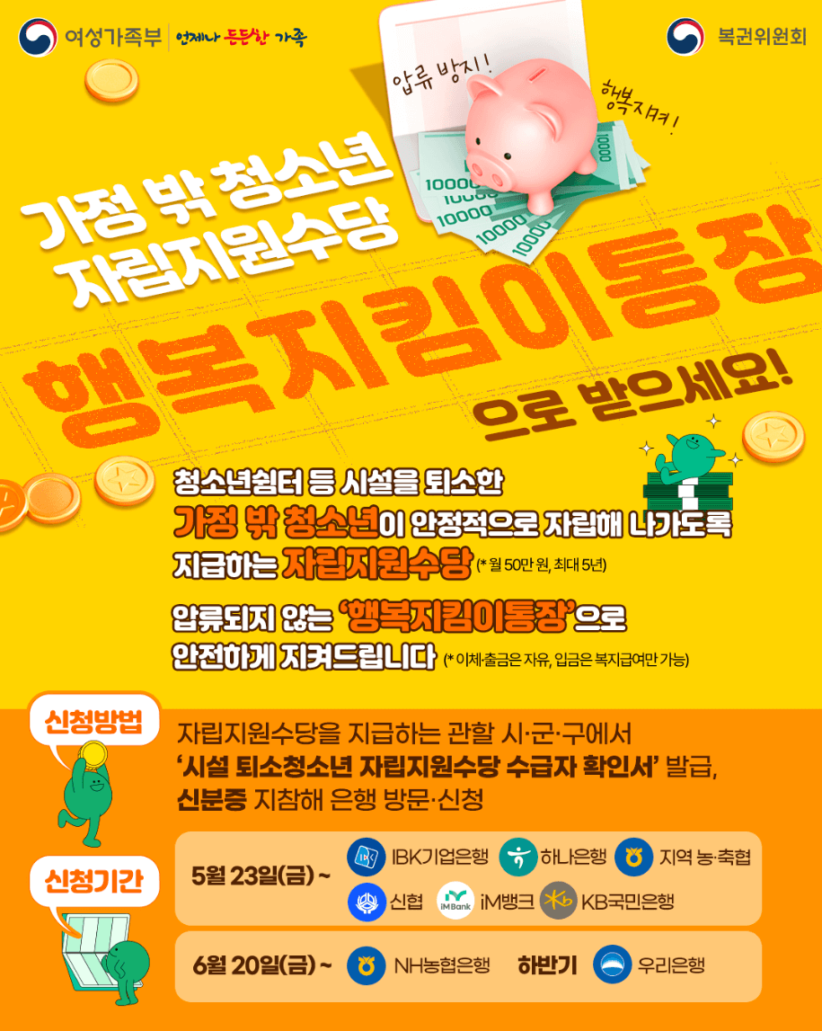 2025년 5월 23일부터 시행된 행복지킴이통장은 가정 밖 청소년이 자립지원수당을 안전하게 수령할 수 있도록 돕는 압류방지 전용통장입니다. 복지급여가 압류되지 않도록 보호하면서 청소년의 자립 기반을 마련하는 데 실질적인 도움을 줍니다.
